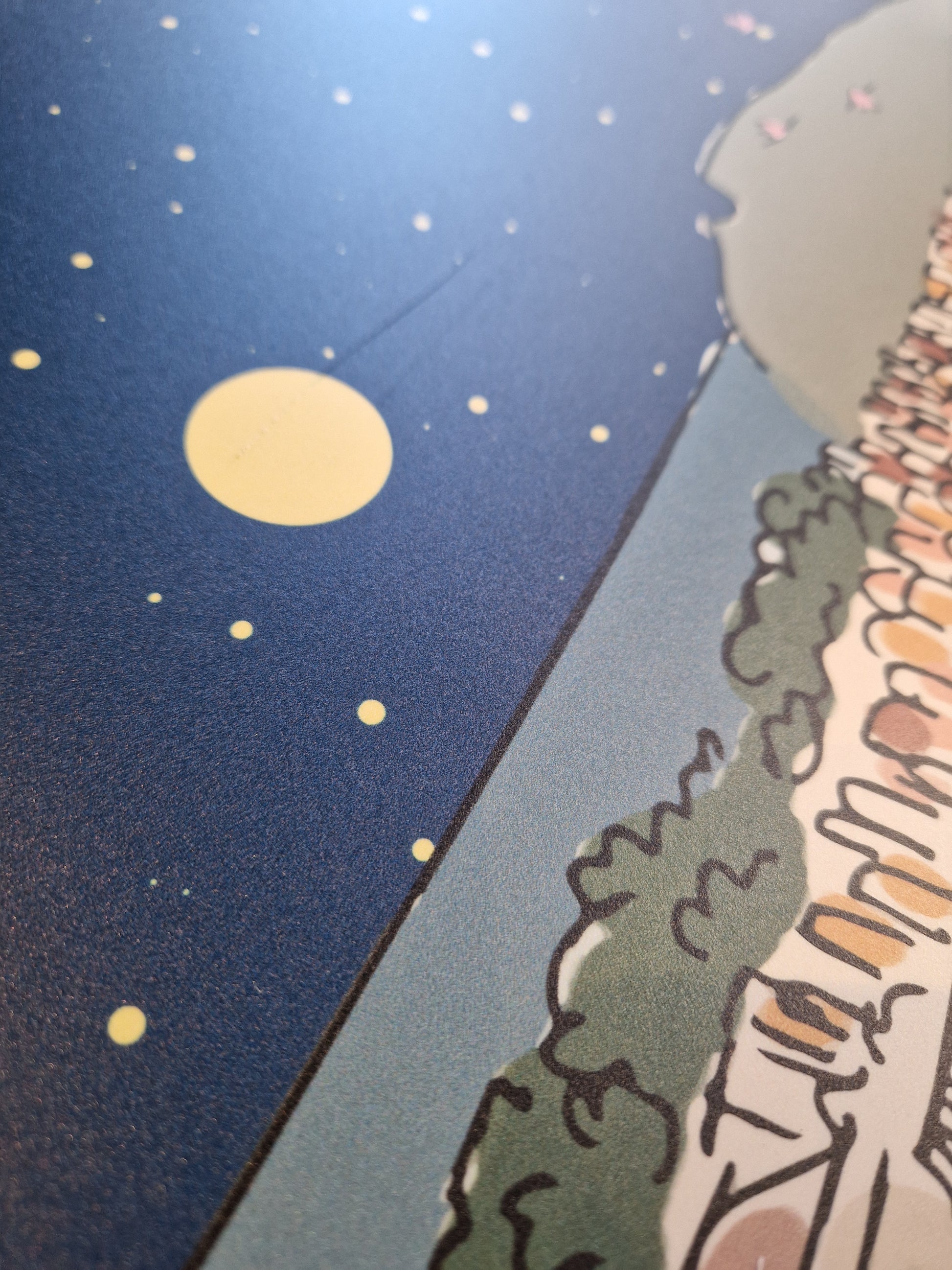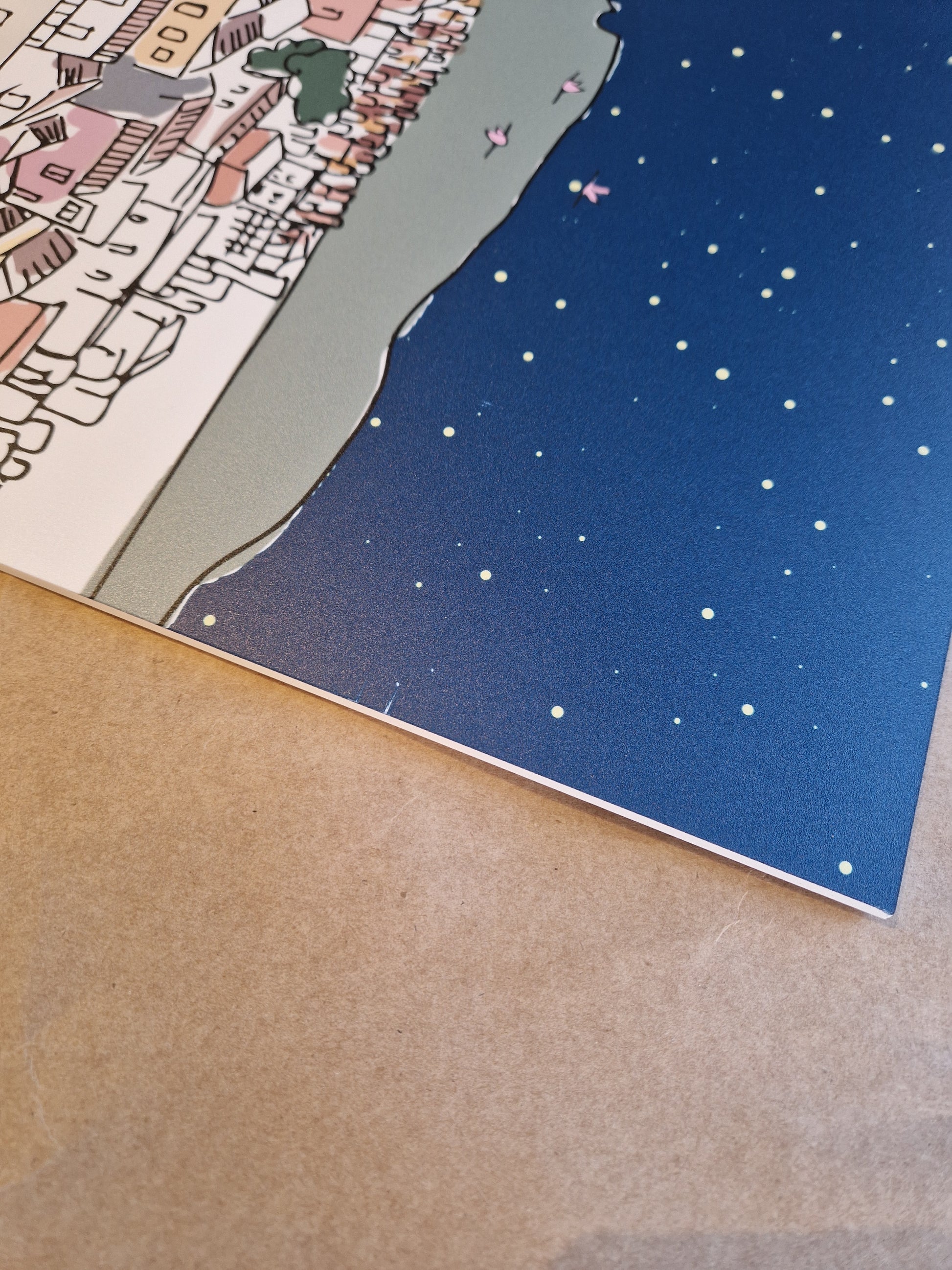 Il quadro "città in volo" nella versione notturna è stampato su forex e ha dimensioni 60x80cm.